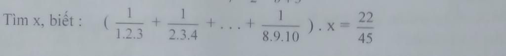 `(1/(1.2.3)+1/(2.3.4)+...+1/(8.9.10)) . x =22/45`