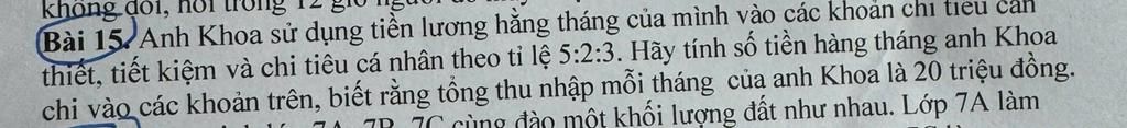 Vì số tiền chi tiêu cần thiết, tiết kiệm và chi tiêu cá nhân tỉ lệ theo `5: 2: 3`