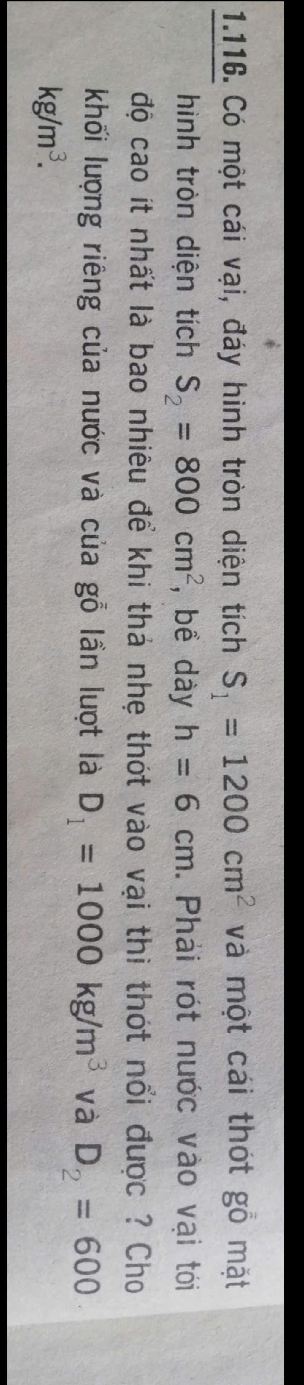 1.116. Có một cái vại, đáy hình tròn diện tích S = 1200 cm và một cái thót gỗ mặt