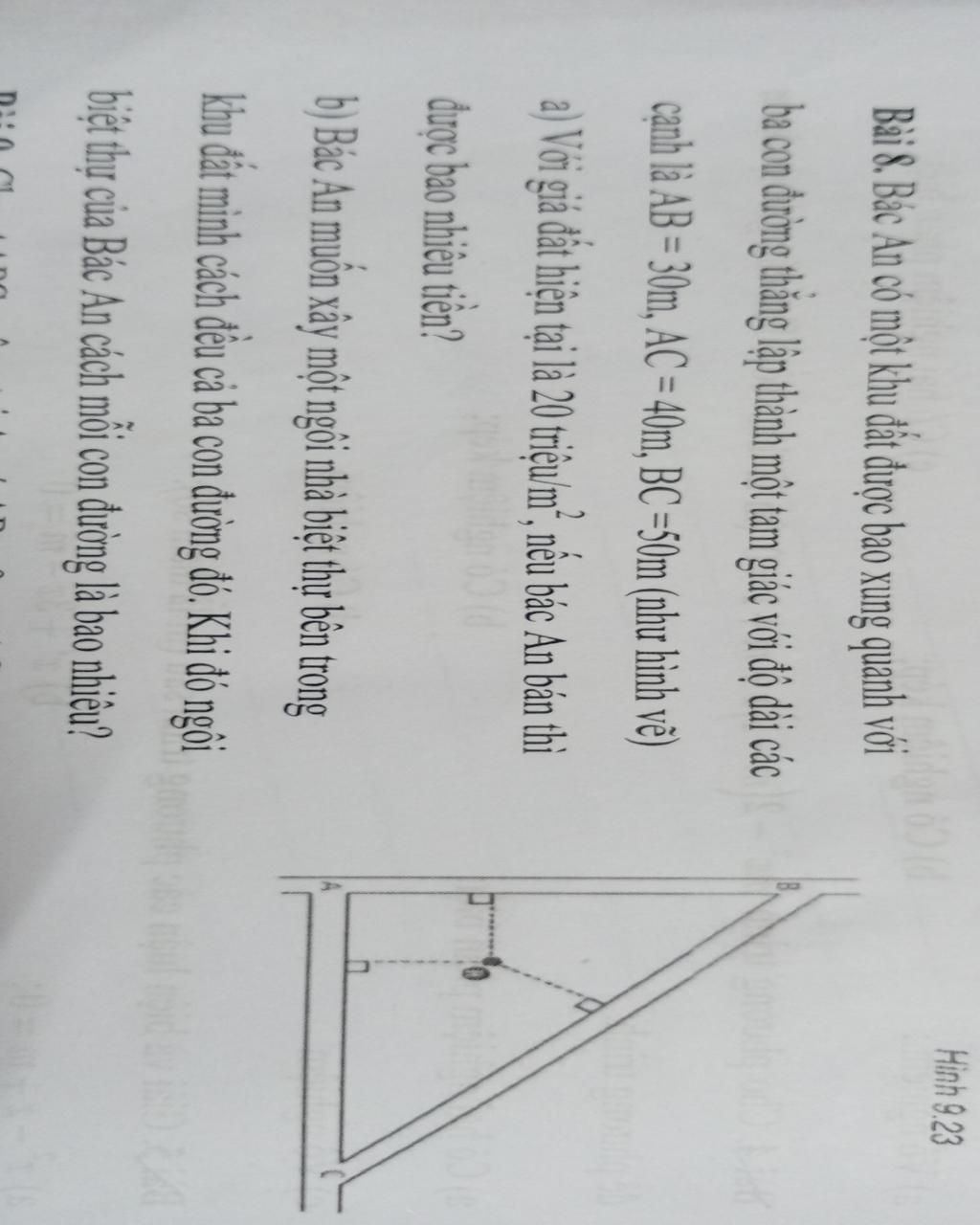 Ngôi nhà biệt thự cách đều ba con đường tức là tâm của nó là tâm đường tròn nội tiếp tam giác ABC