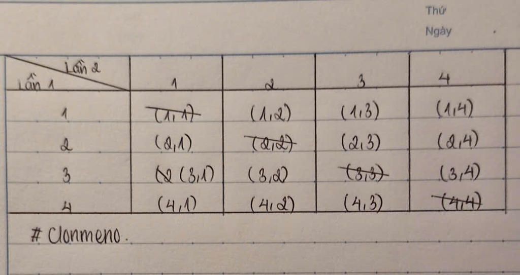 Do đó , cặp có 2 phần tử trùng nhau không được tính, tức là trong bảng ta phải xoá 4 ô : `(1,1);(2,2) ; (3,3) ; (4,4)`. Do đó không gian mẫu của phép thử là : `Omega = {(1,2);(1,3);(1,4);(2,1);(2,3);(2,4);(3,1);(3,2);(3,4)}`.