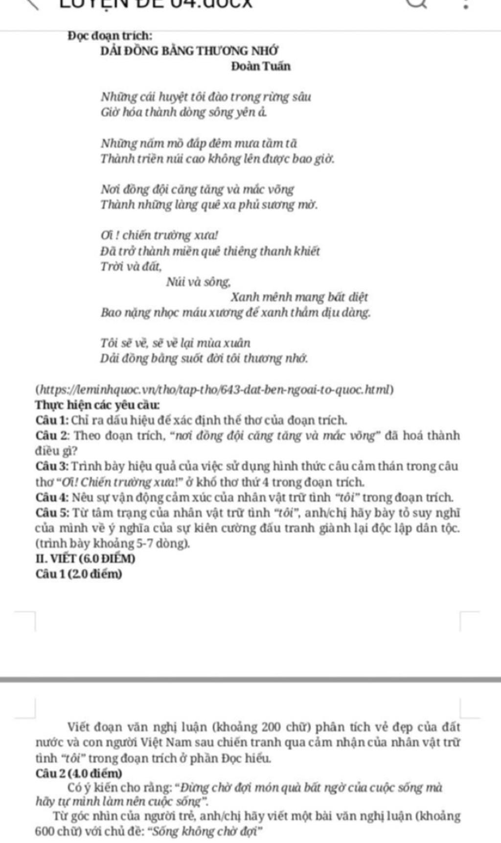 Câu 5: Từ tâm trạng của nhân vật trữ tình “tôi”, anh/chị hãy bày tỏ suy nghĩ của mình về ý nghĩa của sự kiện cường đấu tranh giành lại độc lập dân tộc (trình bày khoảng 5-7 dòng).