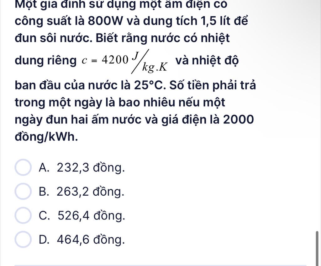 `= 2.1.1,5.4200(100 - 25) = 945000 (J) = 21/80 (kWh)`