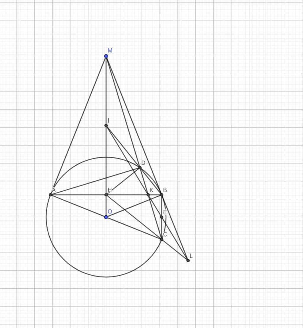 Câu 5: (3,0 điểm) Từ điểm M nằm ngoài đường tròn (O), kẻ các tiếp tuyến MA, MB với (O) ( B, A là các tiếp điểm). Kẻ đường kính AC của (O). Đoạn thẳng MC cắt AB tại K và cắt đường tròn (O) tại điểm thứ hai D. Gọi I, H lần lượt là các giao điểm của MO với BD, AB.