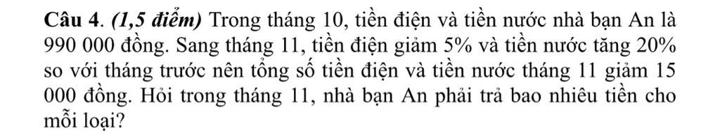 `-` Vì trong tháng 10, tiền điện và tiền nước nhà bạn An là 990 nghìn đồng nên ta có phương trình: