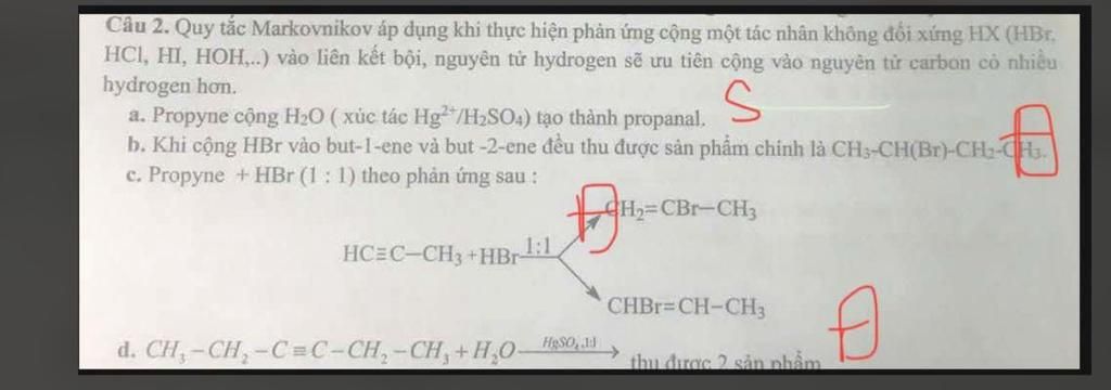 Câu 2. Quy tắc Markovnikov áp dụng khi thực hiện phản ứng cộng một tác nhân không đối xứng HX (HBr.