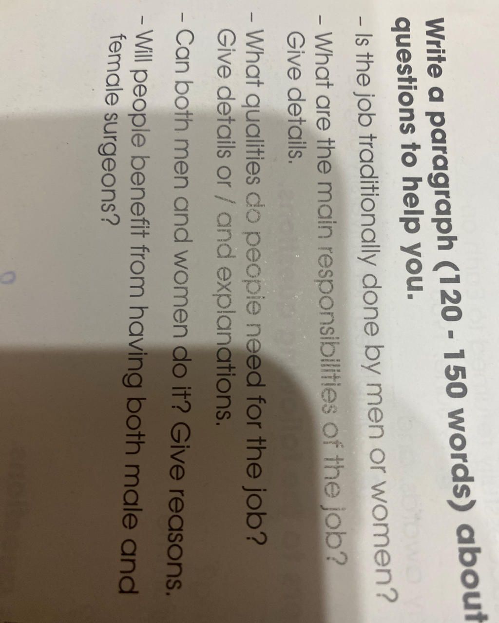 Write a paragraph about the surgeon’s job. Use these guiding questions to help you (Viết một đoạn văn về công việc của bác sĩ phẫu thuật. Sử dụng các câu hỏi hướng dẫn này để giúp bạn)