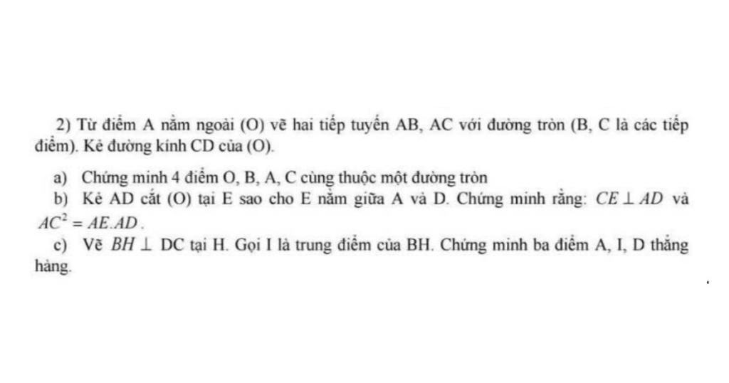2) Từ điểm A nằm ngoài (O) vẽ hai tiếp tuyến AB, AC với đường tròn (B, C là các tiếp