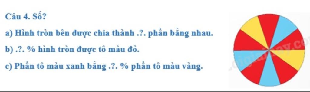 `a)` Theo hình vẽ, ta đếm được hình tròn đó được chia thành `10` phần bằng nhau với `3` màu xanh, đỏ và vàng.