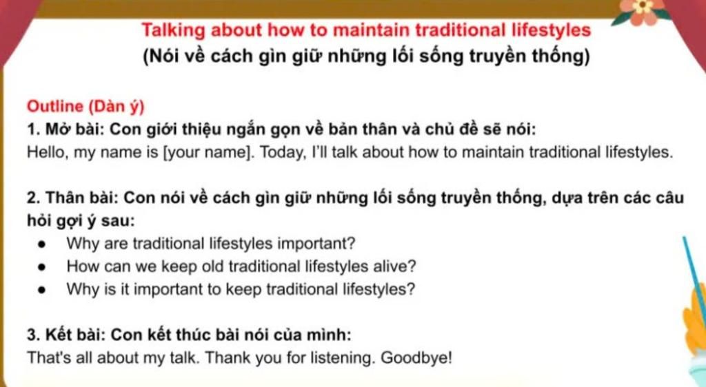 Xin chào, tôi tên là Ngọc. Hôm nay, tôi sẽ nói về cách duy trì lối sống truyền thống.
