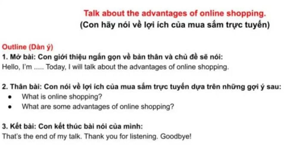 Xin chào, con là [tên của cậu]. Hôm nay, con sẽ nói về lợi ích của mua sắm trực tuyến