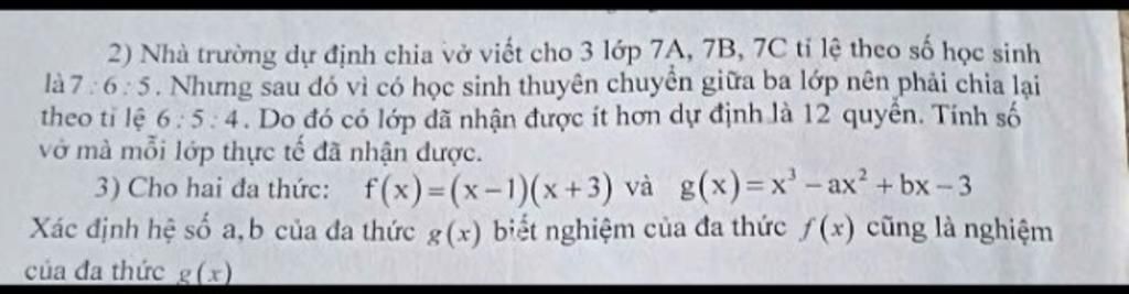 2) Nhà trường dự định chia vở viết cho 3 lớp 7A, 7B, 7C tỉ lệ theo số học sinh