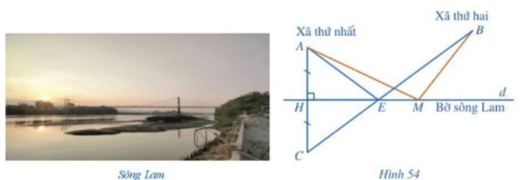 Có hai xã cùng ở một bên bờ sông Lam. Các kĩ sư muốn bắc một cây cầu qua sông Lam cho người dân hai xã. Để thuận lợi cho người dân đi lại, các kĩ sư cần phải chọn vị trí của cây cầu sao cho tổng khoảng cách từ hai xã đến chân cầu là nhỏ nhất. Bạn Nam đề xuất cách xác định vị trí của cây cầu như sau (Hình 54):