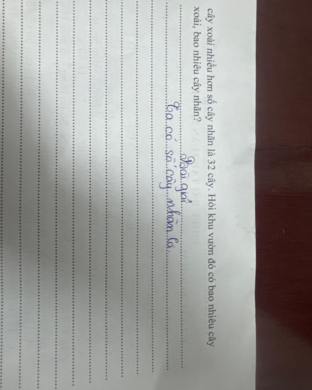 Không đủ đề bài em đọc ạ.trong một khu vườn có số cẫyoài gấp 3 làn số cây nhãn.Biết rằng số cây xoài nhiều hơn số cây nhãn là 32 cây. Hỏi khu vườn đó có bao nhiêu cây xoài,bao nhiêu cây nhãn