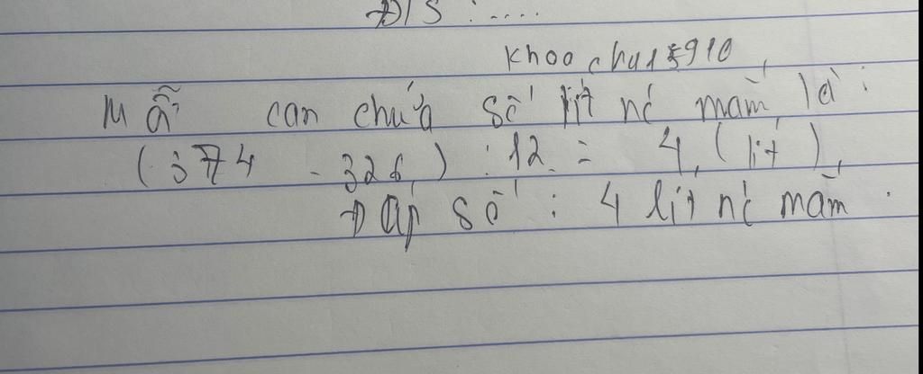 một của hàng nhập về 374l nước mắm. Của hàng đã bán được 326l. Só nước mắm còn lại được chia đều vào 12 can. Hỏi mỗi can chứa bao nhiêu lít nước mắm?