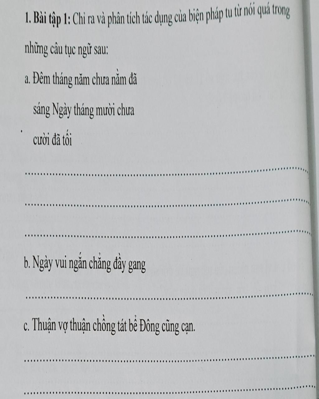 `+` Phóng đại đến mức khó tin , thực tế không đến mức như vậy . '' Đêm tháng năm chưa nằm đã sáng '' ý chỉ rằng đêm thì ngắn còn ngày thì dài . '' Ngày thang mười chưa cười đã tối '' ý chỉ ngày ngắn còn đêm thì dài .