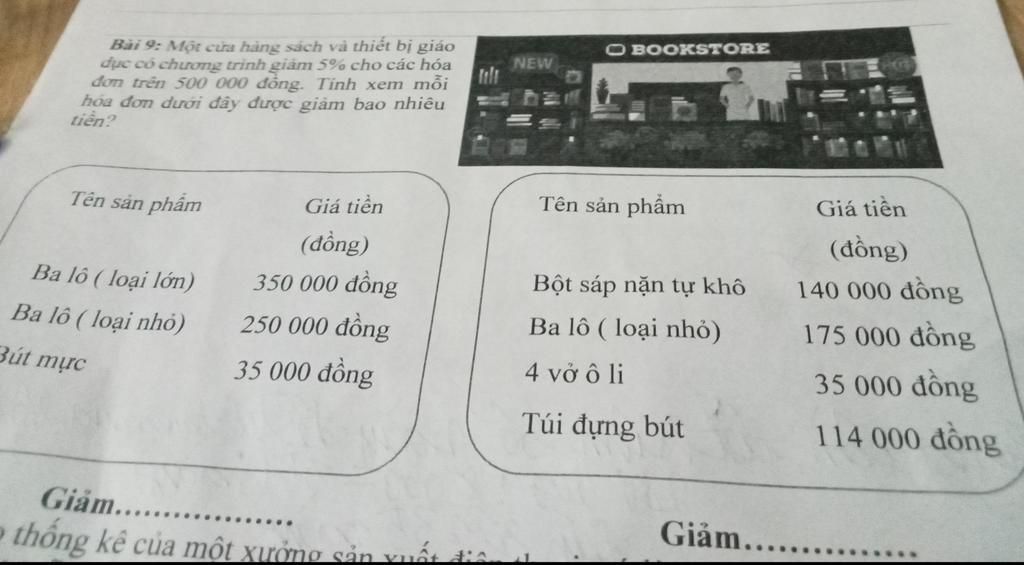 Số tiền của hóa đơn đó là: 350 000+250 000+35 000=635 000(đồng) Vì 635 000>500 000 nên hóa đơn được giảm 5% Số tiền phải trả sau khi giảm 5% là: 635 000:100x5=31 750(đồng) Hóa đơn 2: Số tiền của hóa đơn đó là: 140 000+175 000+35 000+114 000=464 000(đồng) Vì 464 000<500 000 nên hóa đơn không được giảm 5%