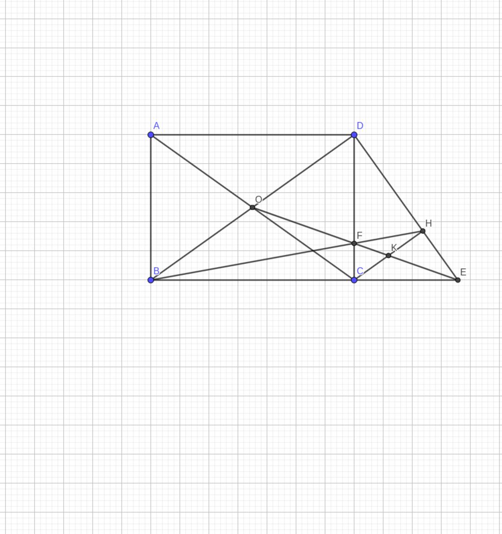Cho hình chữ nhật ABCD có AD=6 cm, AB=8cm, hai đường chéo AC và BD cắt nhau tại Ở. Qua D kẻ đường thẳng d vuông góc với BD, d cắt tia BC tại E