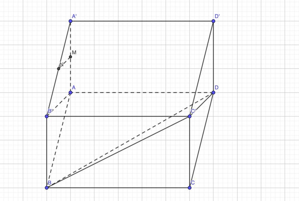 Cho hình hộp ABCD. A'B'C'D' có 6 mặt là hình vuông cạnh bằng a. Gọi M,N lần lượt là trung điểm của cạnh AA' và A'B'. Tính số đo góc giữa hai đường thẳng MN và BD