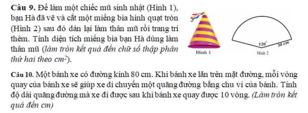 Quãng đường xe đi được sau khi bánh xe quay được $10$ vòng là: