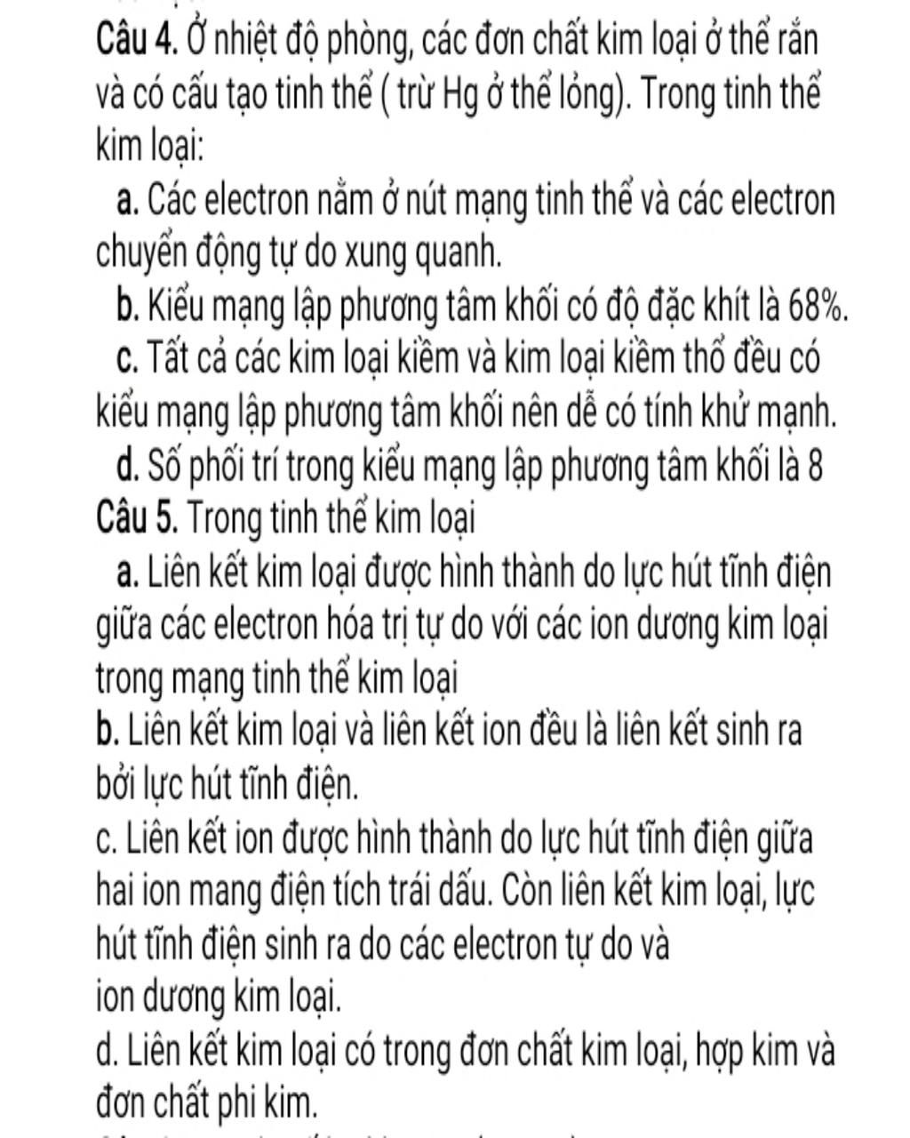 Câu 4. Ở nhiệt độ phòng, các đơn chất kim loại ở thể rắn và có cấu tạo tinh thể ( trừ Hg ở thể lỏng). Trong tinh thể kim loại: