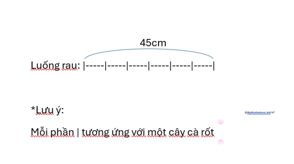 Mẹ trồng một luống rau nhỏ gồm 6 cây cà rốt cách đều nhau. Cây thú nhất cách cây cuối cùng là 45cm. Hỏi khoảng cách giữa khai cây cạnh nhau là bao nhiêu xăng-ti-mét?