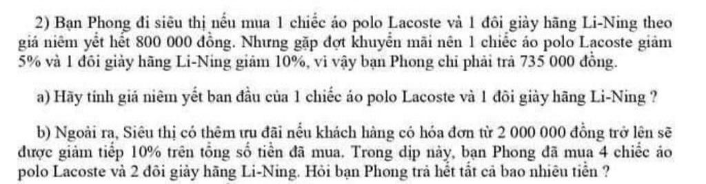 Bạn Phong mua `4` chiếc áo polo Lacoste và `2` đôi giày Li-Ning nếu không giảm gia gì có giá là `:`
