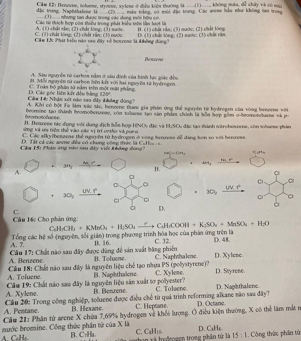 Câu 12: Benzene, toluene, styrene, xylene ở điều kiện thường là .....(1)....., không màu, dễ cháy và có mùi