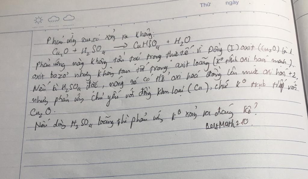 Cu2O + H2SO4->CuHSO4 +H2O hay không ạ?
