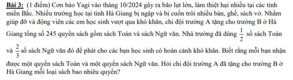 Nhà trường đã dùng `1/2` số sách Toán `2/3` và số sách Ngữ văn đó để phát cho các bạn học sinh có hoàn cảnh khó khăn. Biết rằng mỗi bạn nhận được một quyển sách Toán và một quyển sách Ngữ văn `⇒1/2x=2/3y⇒1/2x-2/3y=0`
