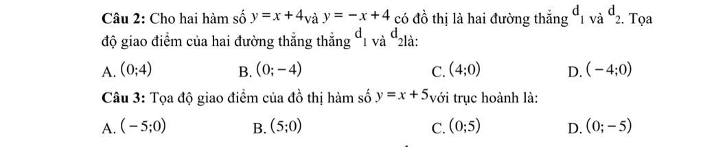 Hai đường thẳng ` d_1 ; d_2 ` cắt nhau ` <=> x + 4 = -x + 4 `