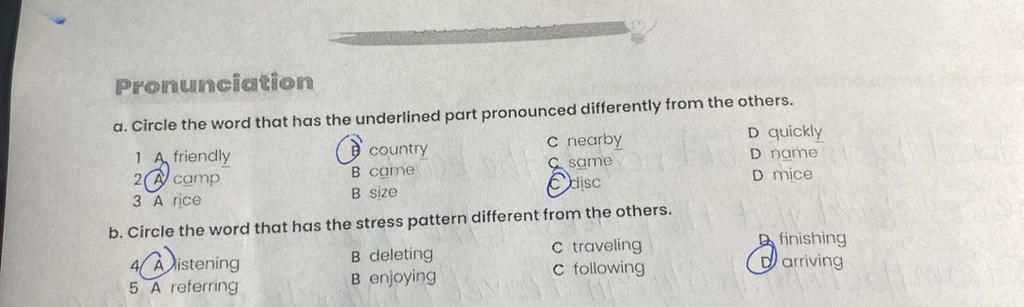 a. Circle the word that has the underlined part pronounced differently from the others.