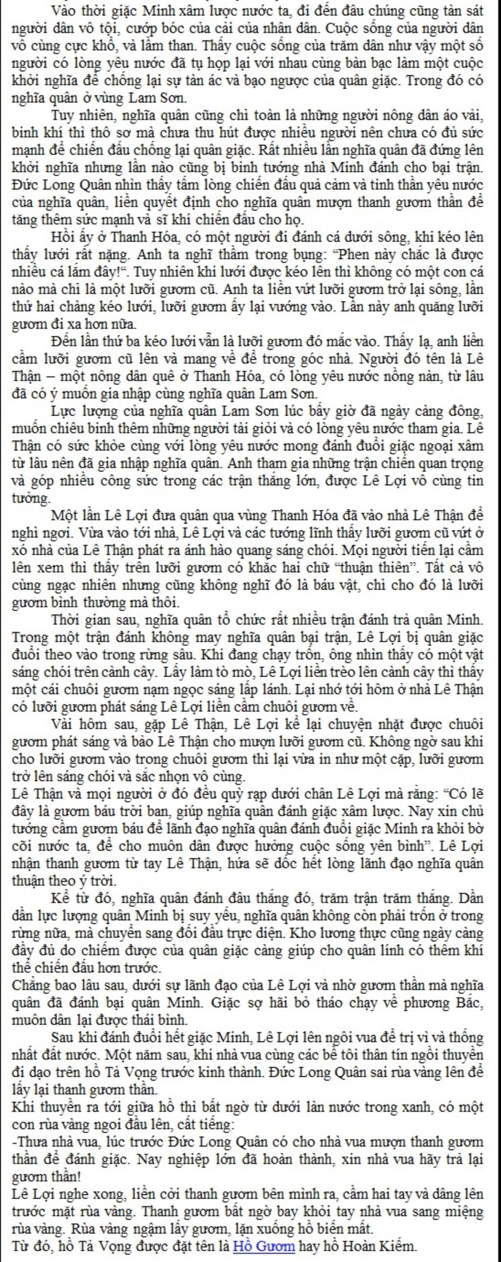 Câu 1: Truyện “Sự tích Hồ Gươm” thuộc thể loại văn học nào? Nêu đặc điểm của truyện để em có thể xác định được thể loại của truyện.