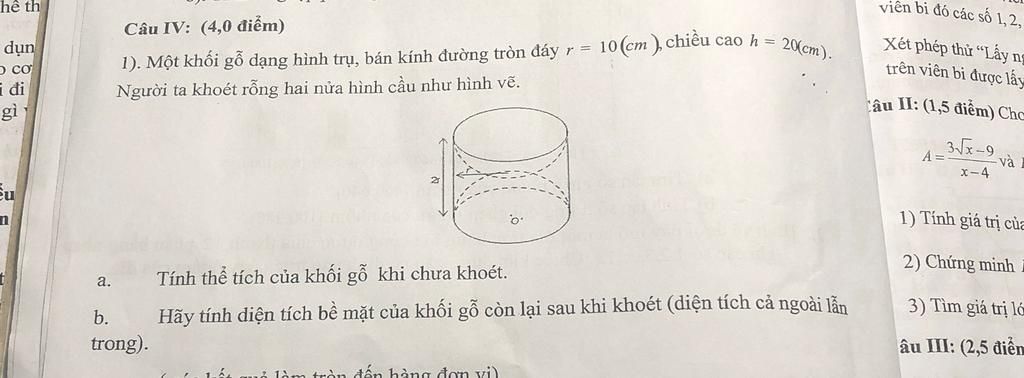 Diện tích bề mặt gỗ là diện tích toàn phần của khối cầu và diện tích xung quanh khối trụ là: