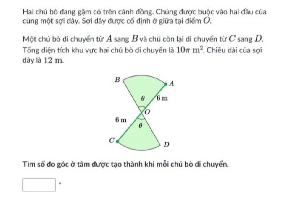 Vậy số đo góc ở tâm được tạo thành khi mỗi chú bò di chuyển là `50^@`