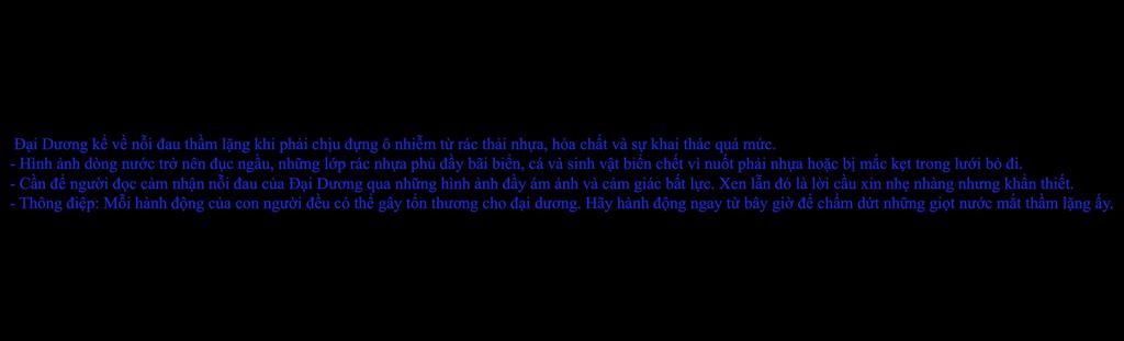 - Thông điệp: Mỗi hành động của con người đều có thể gây tổn thương cho đại dương. Hãy hành động ngay từ bây giờ để chấm dứt những giọt nước mắt thầm lặng ấy.