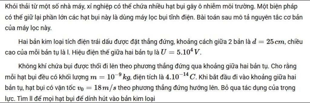 Độ dài `l` để mọi hạt bụi đều dính hút vào bản kim loại là: