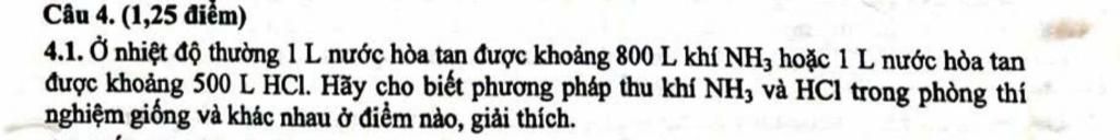 `->` Điểm khác nhau : khi dùng phương pháp thu khí bằng cách đẩy không khí, ống nghiệm thu khí `NH_3` thì ống hướng xuống, còn ống nghiệm thu khí `HCl` thì ống hướng lên.