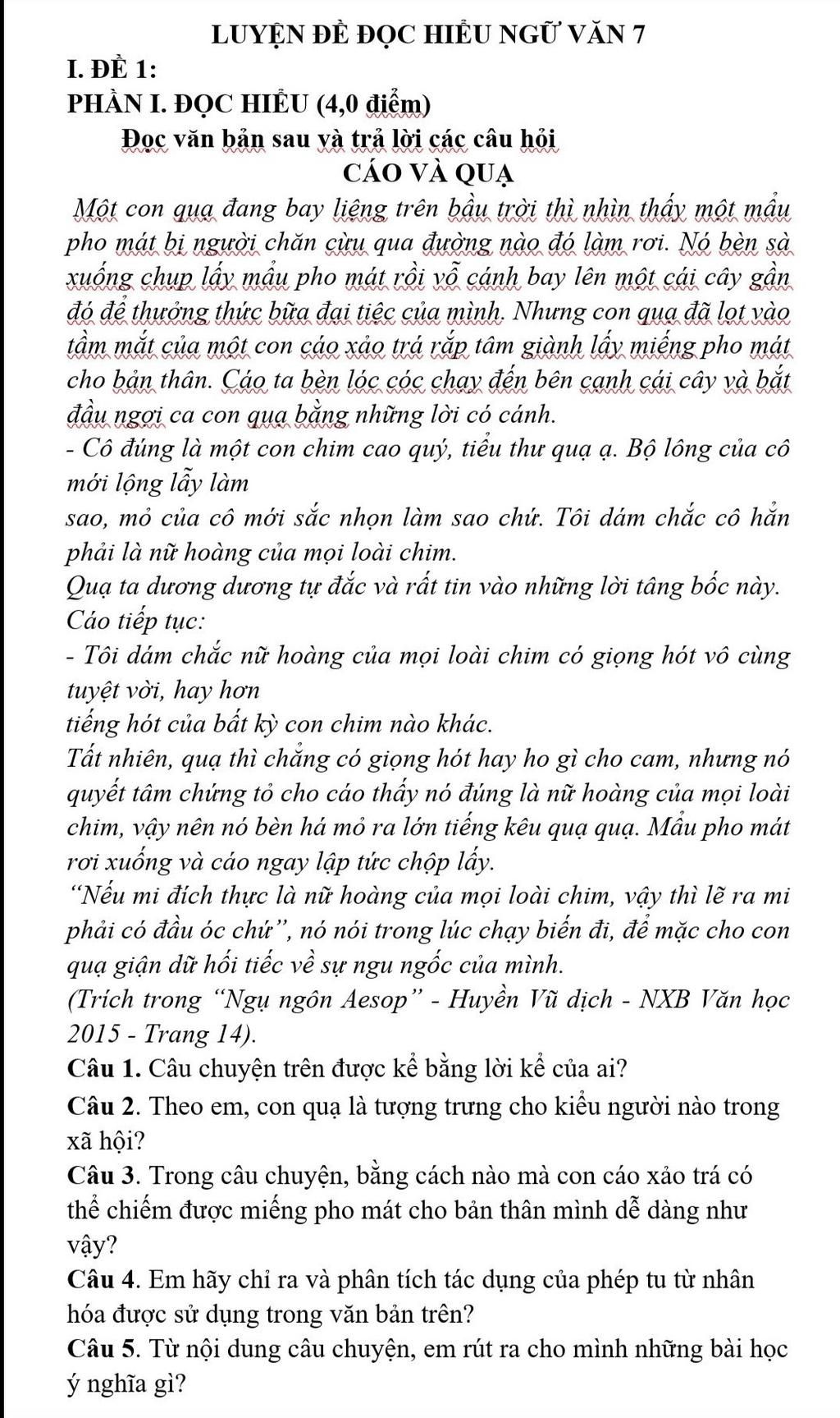 `@` Trong câu chuyện, con cáo xảo trá có thể kiếm được miếng pho mát cho bản thân mình dễ dàng bằng cách: nịnh bợ, ngợi ca con quạ bằng những lời nói có cánh. Cáo khen Quạ có bộ lông lộng lẫy, là nữ hoàng của mọi loại chim, rồi đến giọng hót hay. Quạ bị mắc bẫy nên há miệng ra kêu, chớp lấy thời cơ, Cáo lập tức chộp lấy mẩu phổ mát bị rơi xuống từ miệng Quạ.