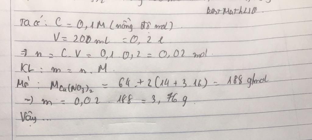 Tính khối lượng của Cu(NO3)2 có trong 200ml dung dịch Cu(NO3)2 0.1M