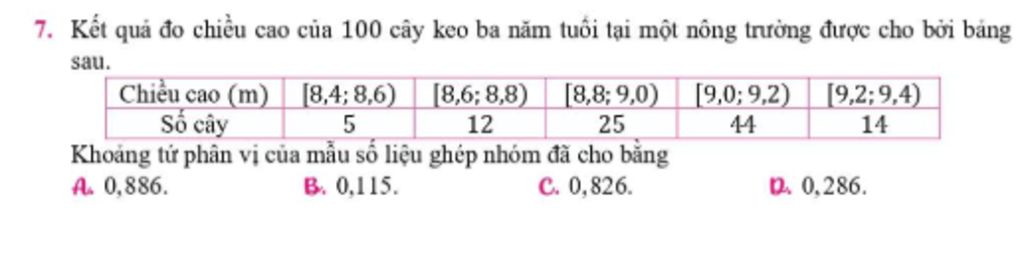 Khoảng tứ phân vị của mẫu số liệu là `Q_3 - Q_1 = 0,286`