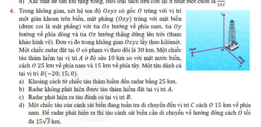 4. Trong không gian, xét hệ tọa độ $O x y z$ có gốc $O$ trùng với vị trí một giàn khoan trên biển, mặt phẳng $(O x y)$ trùng với mạ̉t biển (được coi là mặt phẳng) vởi tia $O x$ hướng về phía nam, tia $O y$ hướng về phia đông và tia $O_z$ hướng thẳng đíng lên trời (tham khảo hình vẽ). Đơn vi đo trong không gian $O x y z$ lấy theo kilômét. Một chiĉ́c radar đặt tại $O$ có phạm vi theo dõi là 30 km . Một chiếc tàu thám hiểm tại vị tri $A$ ở độ sâu 10 km so với mặt nước biênn, cách $O 25 \mathrm{~km}$ về phía nam và 15 km về phia tây. Một tàu dánh cá tại vị trí $B(-20 ; 15 ; 0)$.