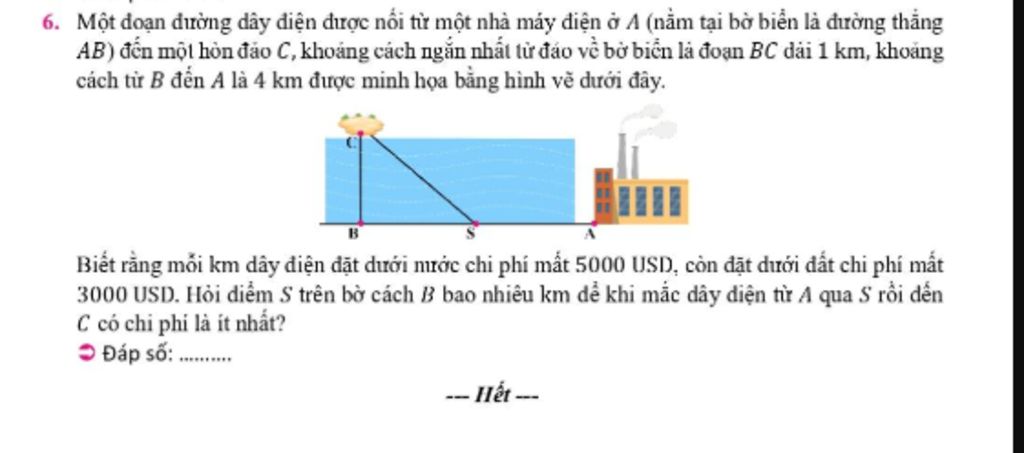 6. Một đọan đường dây điện được nối từ một nhà máy điện ở $A$ (nằm tại bờ biển lả dường thẳng $A B$ ) đến một hơn đảo $C$, khoáng cách ngắn nhất tử đáo về bở biĉ̉n lả đoạn $B C$ dải 1 km , khoảng cách tử $B$ đến $A$ là 4 km được minh họa bằng hình vẽ dưới đây.