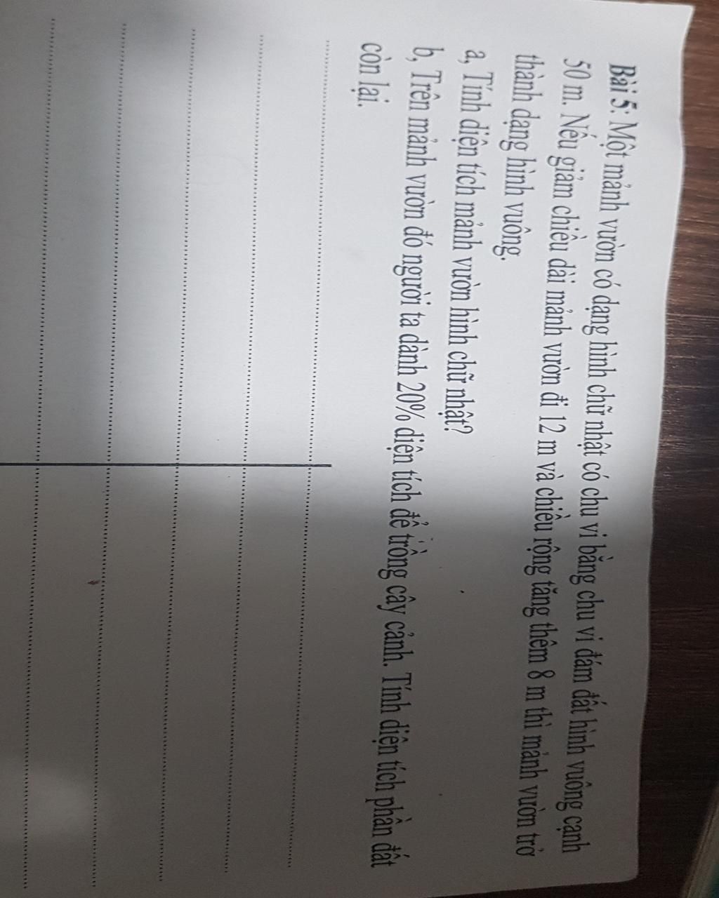 a) Diện tích mảnh vườn hình chữ nhật là 2400 m². b) Diện tích phần đất còn lại là 1920 m².