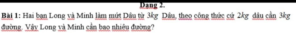Vậy: Số kg đường để làm `3kg` mứt Dâu là: `4,5kg`.