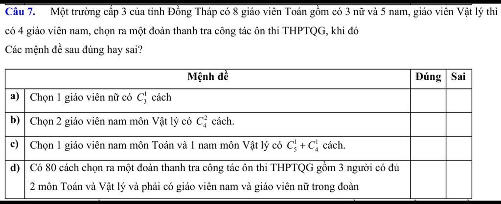 `1` giáo viên nữ Toán `1` giáo viên nam Toán `1` giáo viên nam Vật lý: `C_3^1 \cdot C_5^1 \cdot C_4^1 = 3 \cdot 5 \cdot 4 = 60` cách