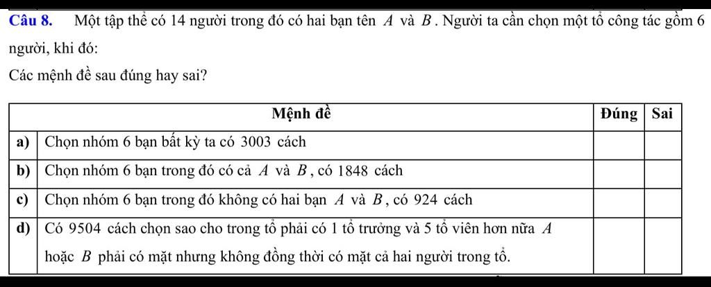 $b)$ Chọn nhóm `6` bạn trong đó có cả `A` và `B`