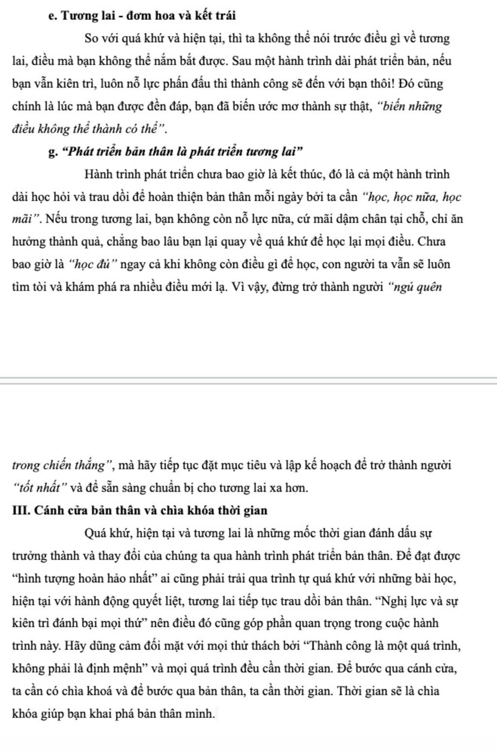 Quá khứ, hiện tại và tương lai, không chỉ là những danh từ đơn thuần mà chúng còn được sử dụng nhằm chỉ sự liên tục của dòng chảy của thời gian. Không có quá khứ thì chẳng thể có hiện tại, cũng không thể có tương lai. Nếu quá khứ là một bài học thì hiện tại chính là thời gian phù hợp nhất để bạn sử dụng những kinh nghiệm của bản thân đã tích lũy được, nhằm phát triển và phục vụ tương lai. Tuy nhiên, “trên đời này không gì là miễn phí”, để nhận được những bài học thì bạn cũng phải vấp ngã cả trăm, cả ngàn lần, điều giúp bạn trưởng thành hơn để đối mặt với vô vàn khó khăn trong hiện tại và tương lai. Trên con đường phát triển, không lúc nào là dễ dàng cả và thời gian sẽ giúp bạn đủ trưởng thành nhằm tìm ra giải pháp tốt nhất để đối mặt với mọi thách thức.