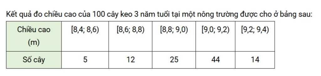 Tổng số cây keo `3` năm tuổi của nông trường `n=100`$\\$ Tỉ số cây có chiều cao từ `8,4\ và m` đến dưới `8,6\ m` là: `5/100=5%`$\\$ Tỉ số cây có chiều cao từ `8,6\ m` đến dưới `8,8\ m` là: `12/100=12%`$\\$ Tỉ số cây có chiều cao từ `8,8\ m` đến dưới `9,0\ m` là: `25/100=25%`$\\$ Tỉ số cây có chiều cao từ `9,0\ m` đến dưới `9,2\ m` là: `44/100=44%`$\\$ Tỉ số cây có chiều cao từ `9,2\ m` đến dưới `9,4\ m` là: `14/100=14%`$\\$ Bảng tần số tương đối ghép nhóm cho mẫu số này với các nhóm `[8,4;8,6),[8,6;8,8),[8,8;9,0),[9,0;9,2),[9,2;9,4)` là: \begin{array}{|c|c|}\hline \text{Chiều cao (m)}&\text{Tần số tương đối}\\\hline \text{[8,4;8,6)}&\text{5%}\\\hline \text{[8,6;8,8)}&\text{12%}\\\hline \text{[8,8;9,0)}&\text{25%}\\\hline \text{[9,0;9,2)}&\text{44%}\\\hline \text{[9,2;9,4)}&\text{14%}\\\hline\end{array}