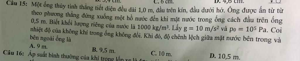 `to` Điều này là không thể, từ kết quả tính `h = 5 (m)` thì lớn lơn chiều dài ống là sai nên đề bài không hợp lý từ chỗ thay đổi mực nước đến các giá trị đáp án.